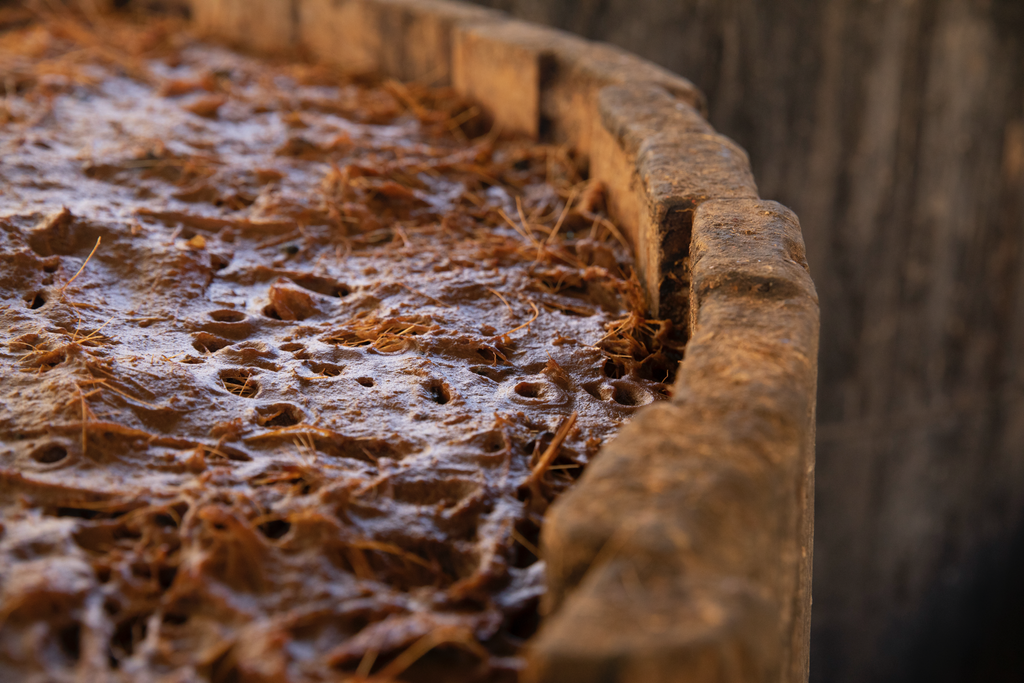 The sweet fruit is now transferred to a round, above-ground pit, where a traditional stone wheel, usually pulled by a donkey, breaks down the cooked agave into a mash.